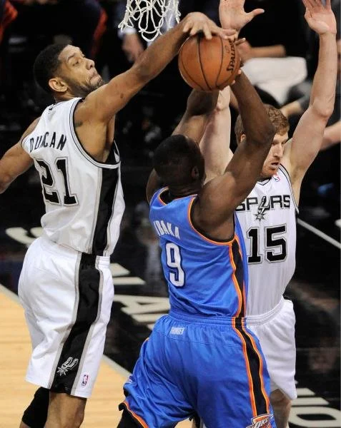 While the Spurs got big-time contributions across-the-board, Manu Ginobili's stood out as he had a memorable throwback performance scoring 19 points in 21 minutes on 7-9 shooting (3-4 from distance) with 6 assists and 4 rebounds. He even, albeit accidentally, bitch slapped the 2014 NBA MVP while going for a steal late in the third quarter. Not to be outdone in the "Throwback Thursday" department, Tim Duncan snatched player of the game honors away from Manu because he also had a vintage performance scoring 22 points on 8-13 shooting while hauling in 12 rebounds and adding one of the most emphatic blocks in recent memory against the no longer in our heads (thanks Cory Joseph) Serge Ibaka. While there was most definitely palpable tension in the air throughout the city of San Antonio over the last couple of days after our disappointing performances in Oklahoma City earlier in this week, the Spurs answered the call at home once again to put Spurs fans minds at ease. Although the circumstances of coming home with the series tied 2-2, in and of themselves, didn't necessarily warrant the panic Spurs fans were experiencing, it was the demons of the 2012 Western Conference Finals that caused a "here we go again" overreaction from late Tuesday night until the tip-off of Game 5. But last night those demons were fully exorcised as the Spurs proved that the Oklahoma City Thunder are still miles away from competing at a level that would allow them to win the game that they need in San Antonio in order to advance to the NBA Finals.
